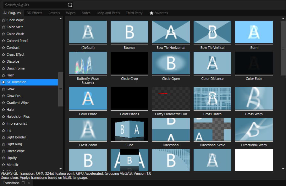 Use this window to choose and preview transition effects that you can use to control how a video event begins or ends, or to change the way one event flows into another.