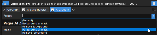In the Video Event FX window, click the Z-Depth effect and select Foreground as mask / Background as mask from the Preset drop-down list.