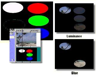 Use the Mask Generator Filter to control the transparency of Video Events that have been placed in the Mask Roll, but it can also be applied to any Video Event. But it can also be applied to any video event. The following illustration demonstrates some of the effects of the Mask Generator. The background image is the original mask. There are five ellipses on the mask: white, red, green, blue and an invisible Alpha Channel (the broken (dashed) line ellipse in the lower left of the mask). Alpha Channels can be based on a color or they can be defined in a paint program that supports Alpha Channel creation. Masks with Alpha Channels must be saved in a format that supports this method of transparency, such as TGA or PNG. As in the following example, the Alpha Channel may be invisible in the actual Mask.