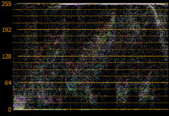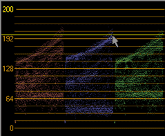The RGB parade monitor in the Video Scopes window displays waveforms for the red, green, and blue components of your video signal. The monitor plots RGB values from 0-255.