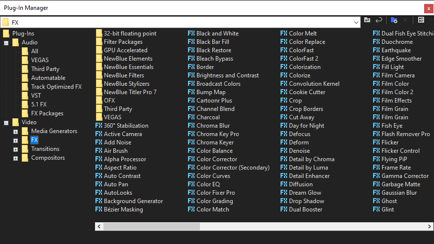 You can use this window to access effects and effects packages that can be applied to events, tracks, and buses. This window also allows you to rename and reorganize plug-ins.