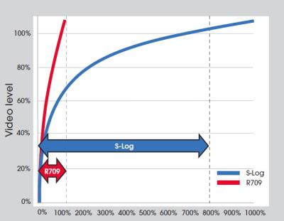 In order to capture the full dynamic range that the camera is capable of, Sony developed the S-Log encoding system, which reproportions the pixel encoding values using a logarithmic curve to capture greater dynamic range. As seen in the chart below, S-Log captures many more stops than typical video encoding: