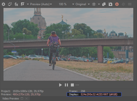 When color management is active, the selected view transform is displayed in the Video Preview window.