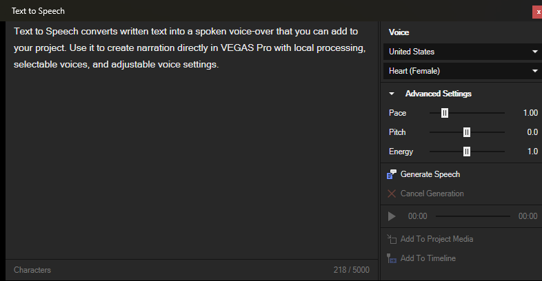 Text to Speech converts written text into spoken voice-over. Use it to generate narration offline on your computer in Vegas Pro, with selectable voices and adjustable voice settings. Add the generated speech to Project Media or place it on the timeline.