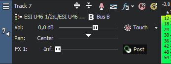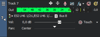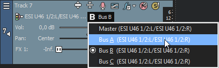 The bus button in a track header chooses the track's primary output. Assigning tracks to busses is especially useful for creating submixes that allow you to adjust the levels of multiple tracks at once or apply an effect to multiple tracks. »For further information: Creating a cue (headphone) mix with the Mixing Console