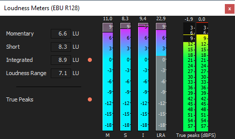 When using EBU R 128, the target value of the Integrated meter is -23 LUFS, and the maximum True peak value is -1.0 dB FS. Use this mode when you're mastering toEuropean Broadcasting Union (EBU) standards.